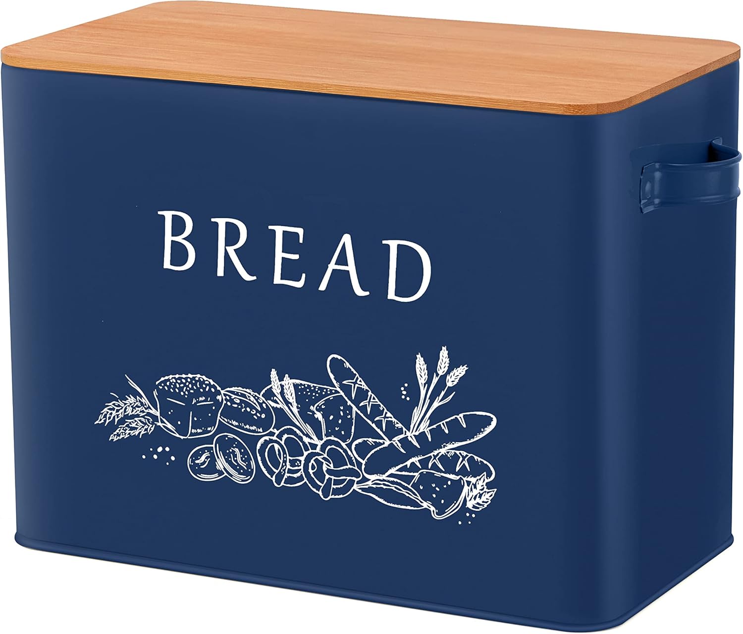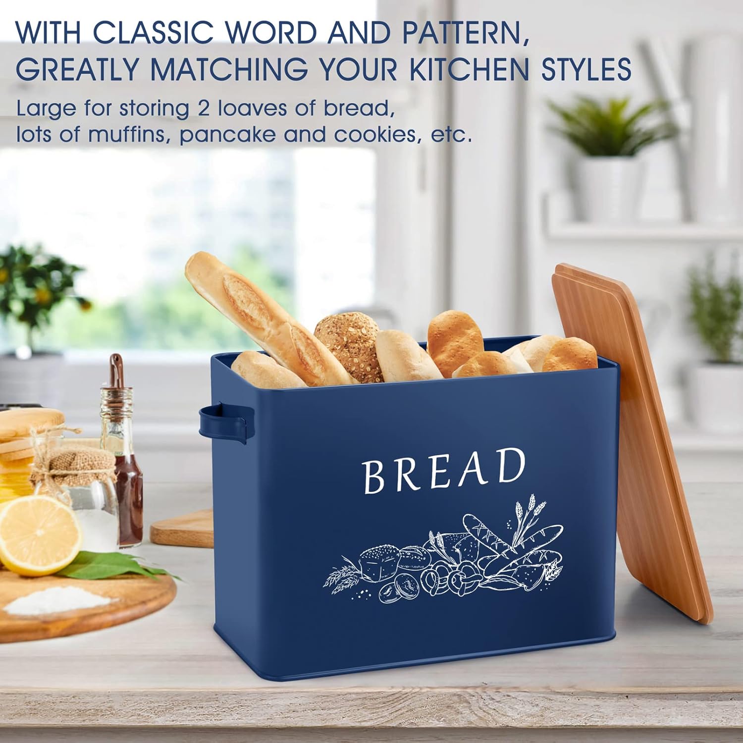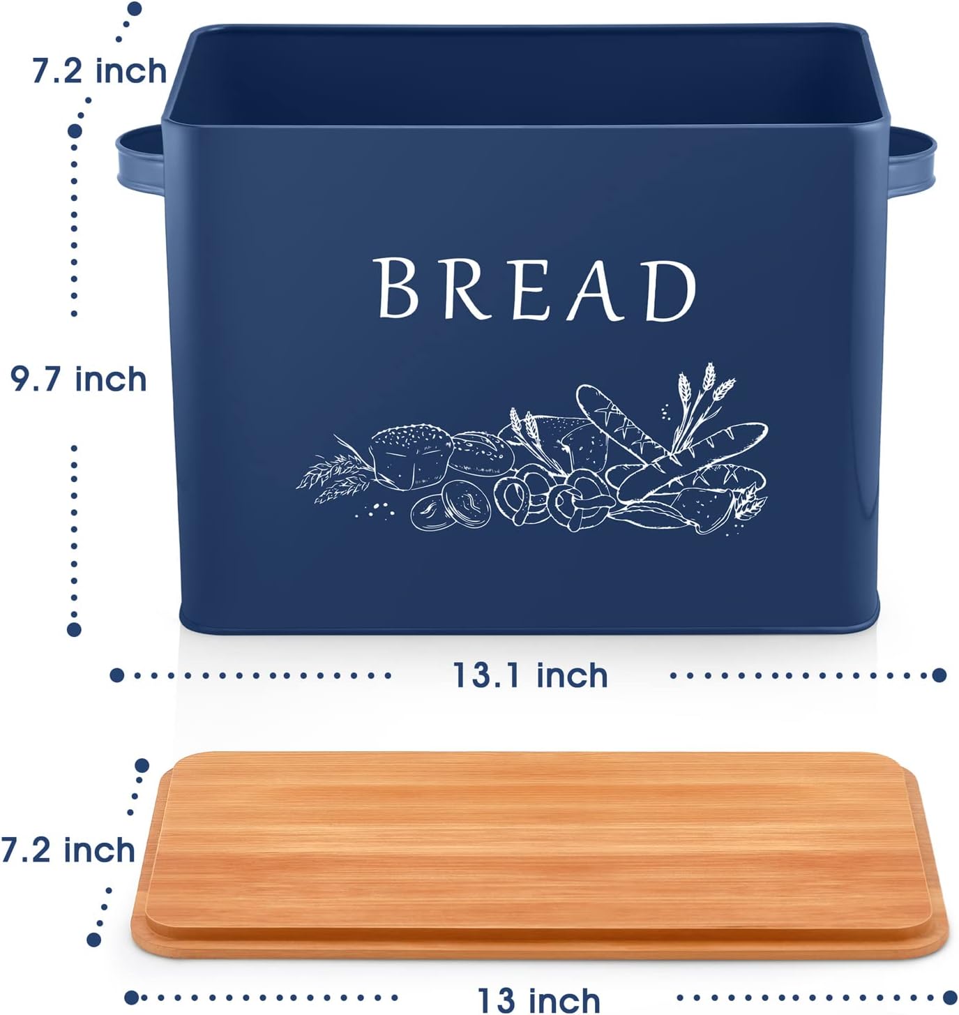 TeamFar Bread Box with Wooden Lid, 13.1”x7.2”x9.7” Metal Bread Container Storage Holder for Family Farmhouse Kitchen Countertop, Powder-Coated & Healthy, Large Capacity & Classic Pattern (Dark Blue)