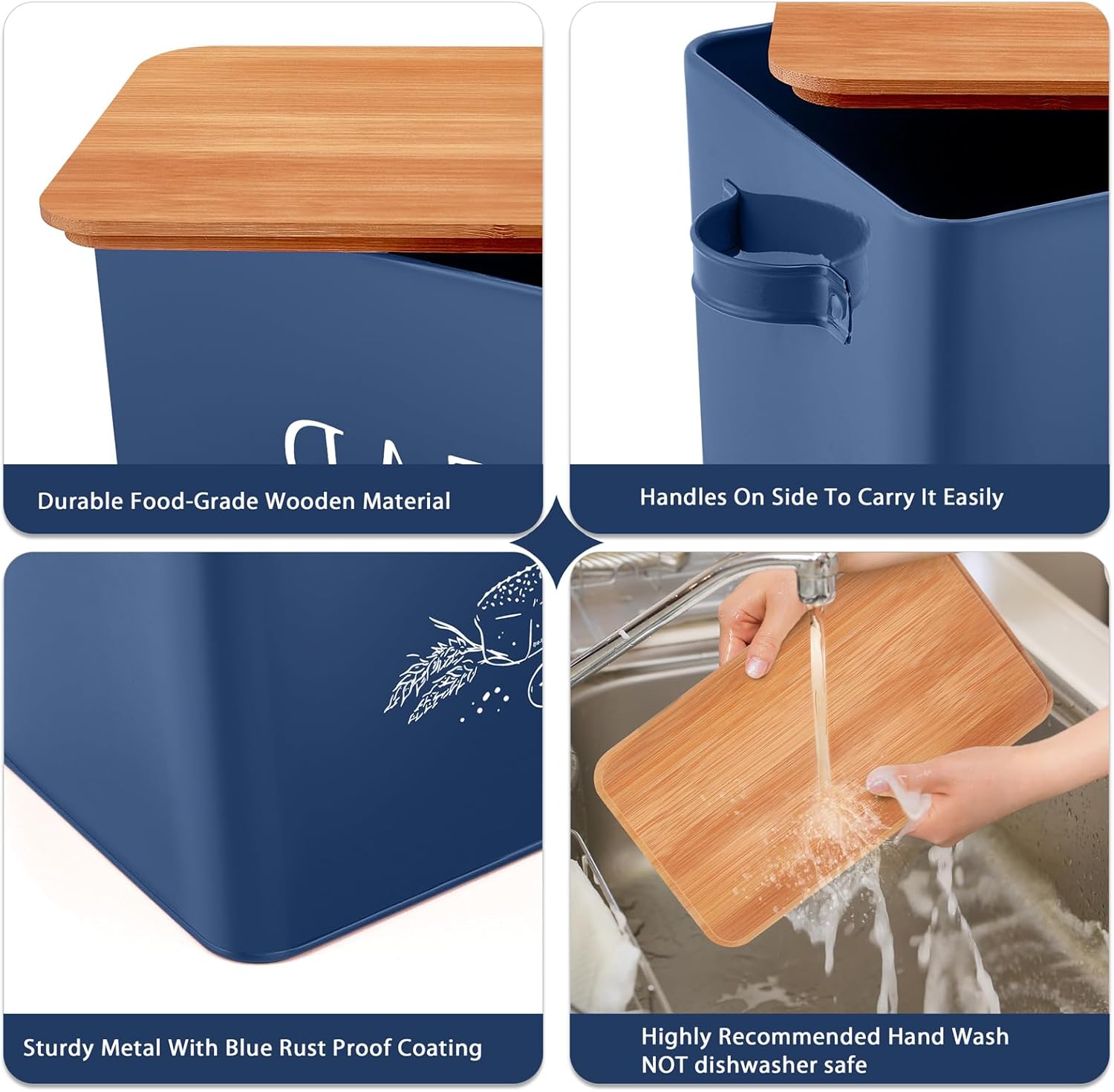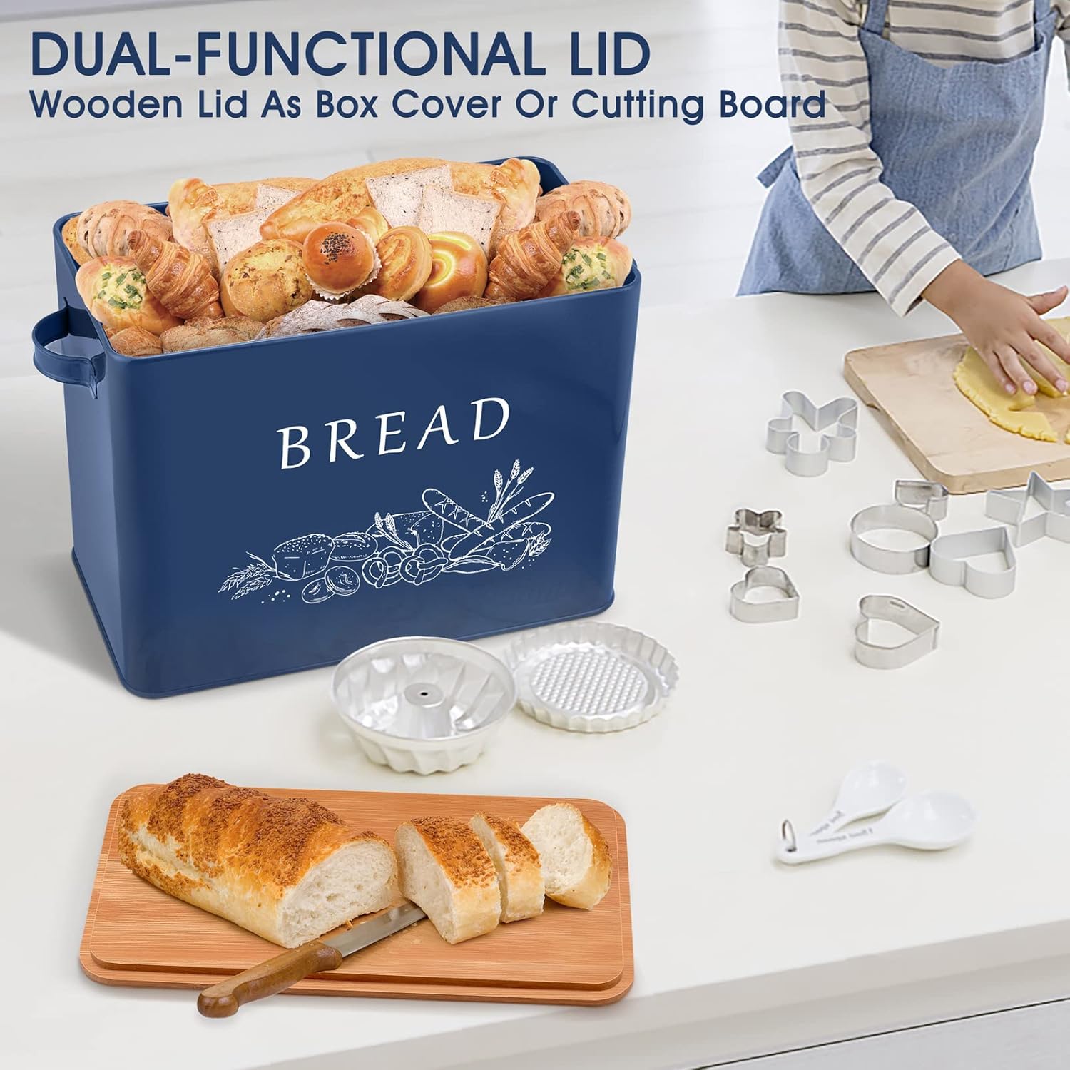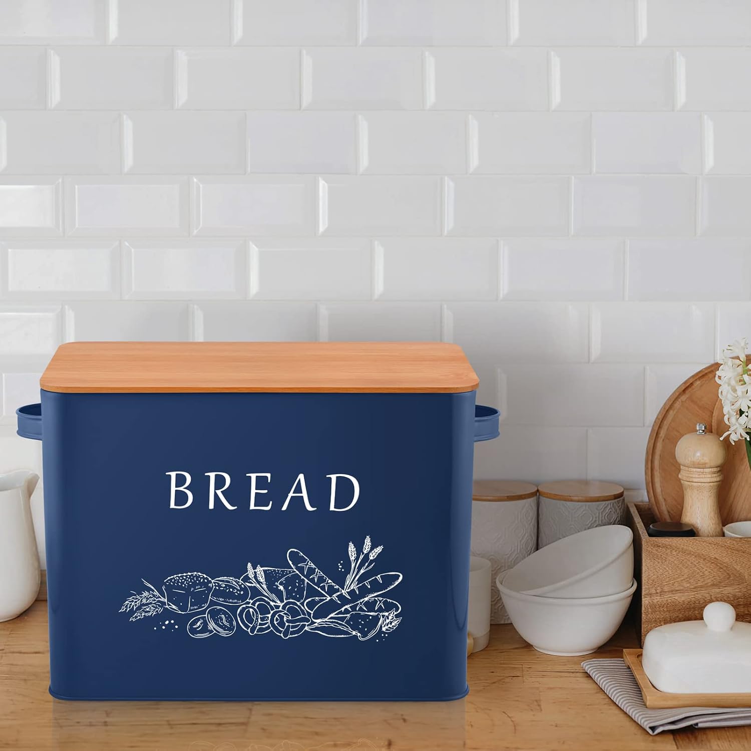 TeamFar Bread Box with Wooden Lid, 13.1”x7.2”x9.7” Metal Bread Container Storage Holder for Family Farmhouse Kitchen Countertop, Powder-Coated & Healthy, Large Capacity & Classic Pattern (Dark Blue)